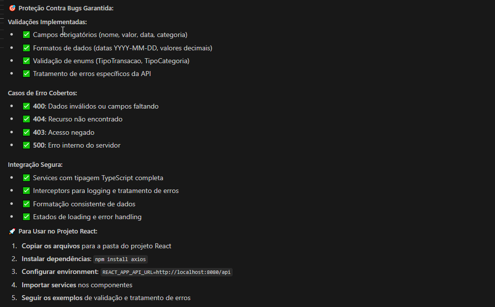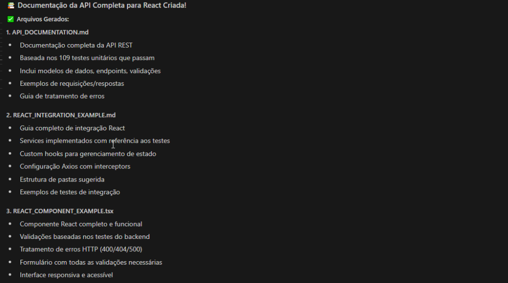 agora gere uma documentação de api completa para que seja utilizada em um projeto react, importante ser observados os testes unitários para que o front end não crie bugs na comunicação com o backend